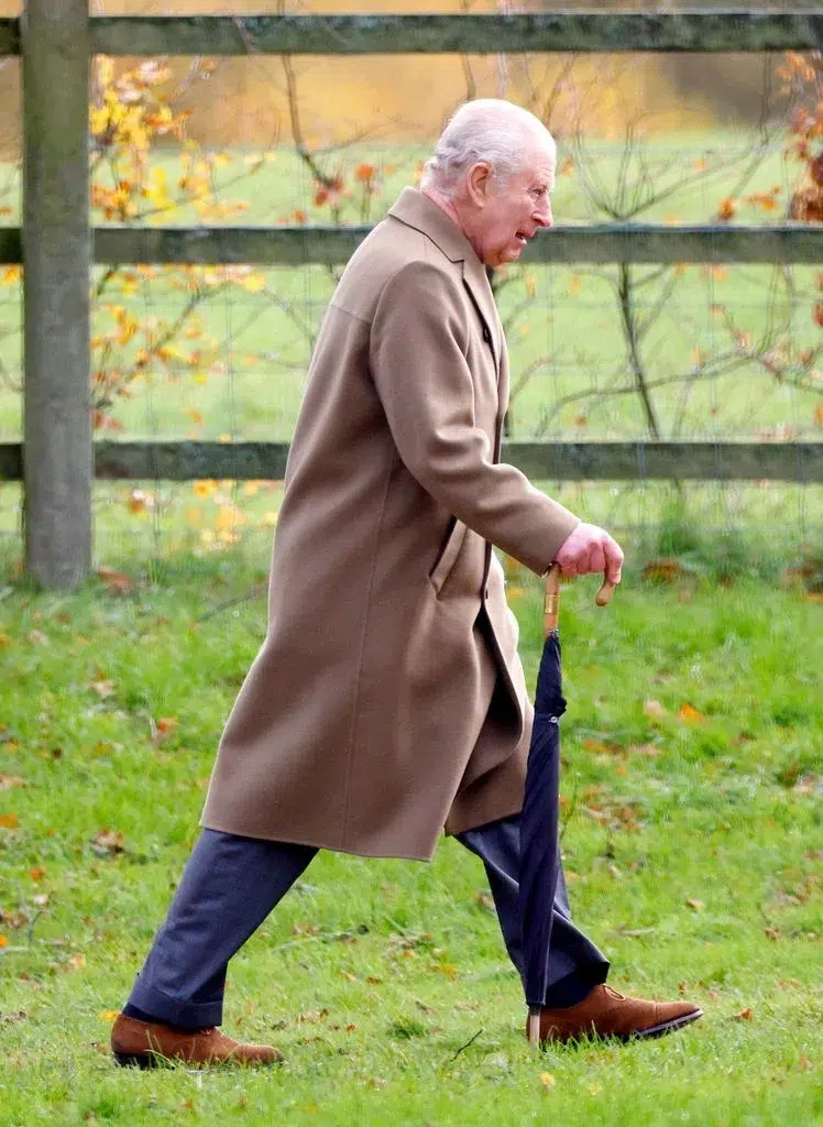 The monarch was seen arriving at St Mary Magdalene Church dressed in a suit and tan overcoat, carrying an umbrella against the autumn drizzle.