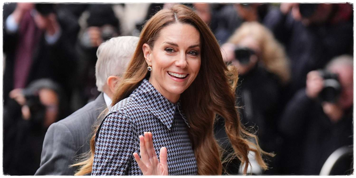 Kate looked radiant for the engagement, wearing a chic checked long-sleeve dress finished with a matching belt for a polished touch. Her chestnut hair was styled in soft, flowing curls that caught the breeze as she waved to the crowds on arrival.
